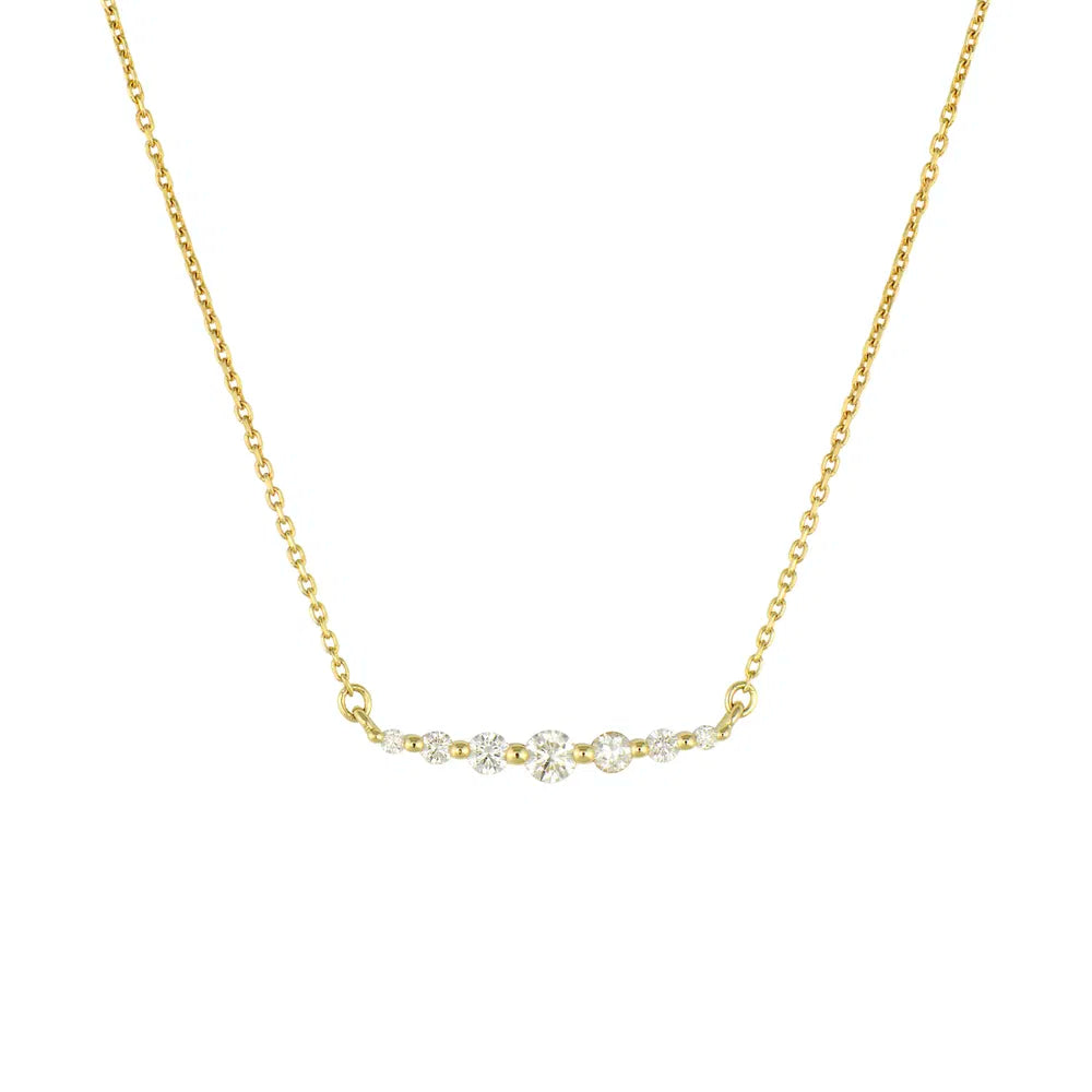 The Small Graduated Diamond Necklace offers understated elegance with sophisticated detail. Crafted in 14K gold, this delicate piece features a small curved diamond bar with prong-set diamonds that graduate in size, creating a gentle flow of sparkle across your neckline. The curved design adds subtle movement and grace to this refined necklace.
