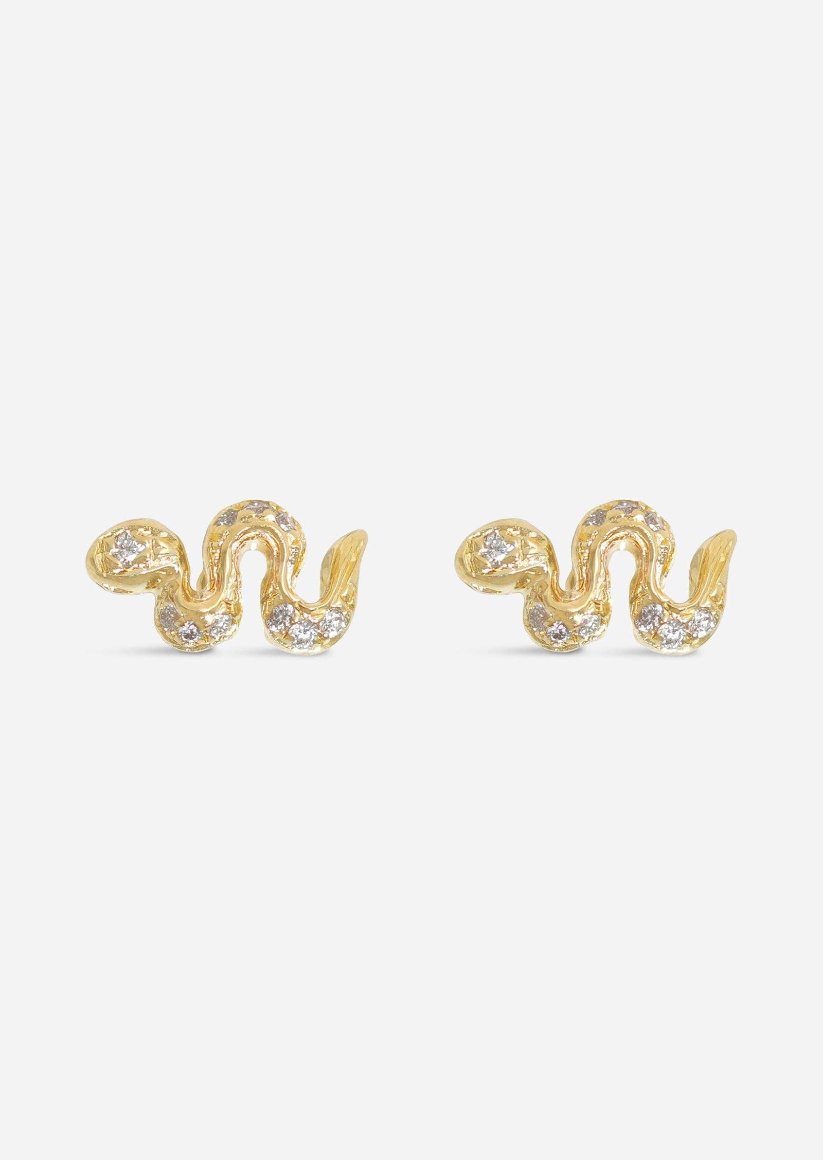 The mini snake stud with our signature evil eye threaded flat back. The perfect dainty addition to your ear party to leave in and never take out. Want to change this earring to a butterfly back? Fill out this form here. Width: 6mm, 18 Gauge Solid 14K Gold, nickel free and hypoallergenic, Diamonds Kimberly Certified Diamonds (Conflict Free) Single Earring
