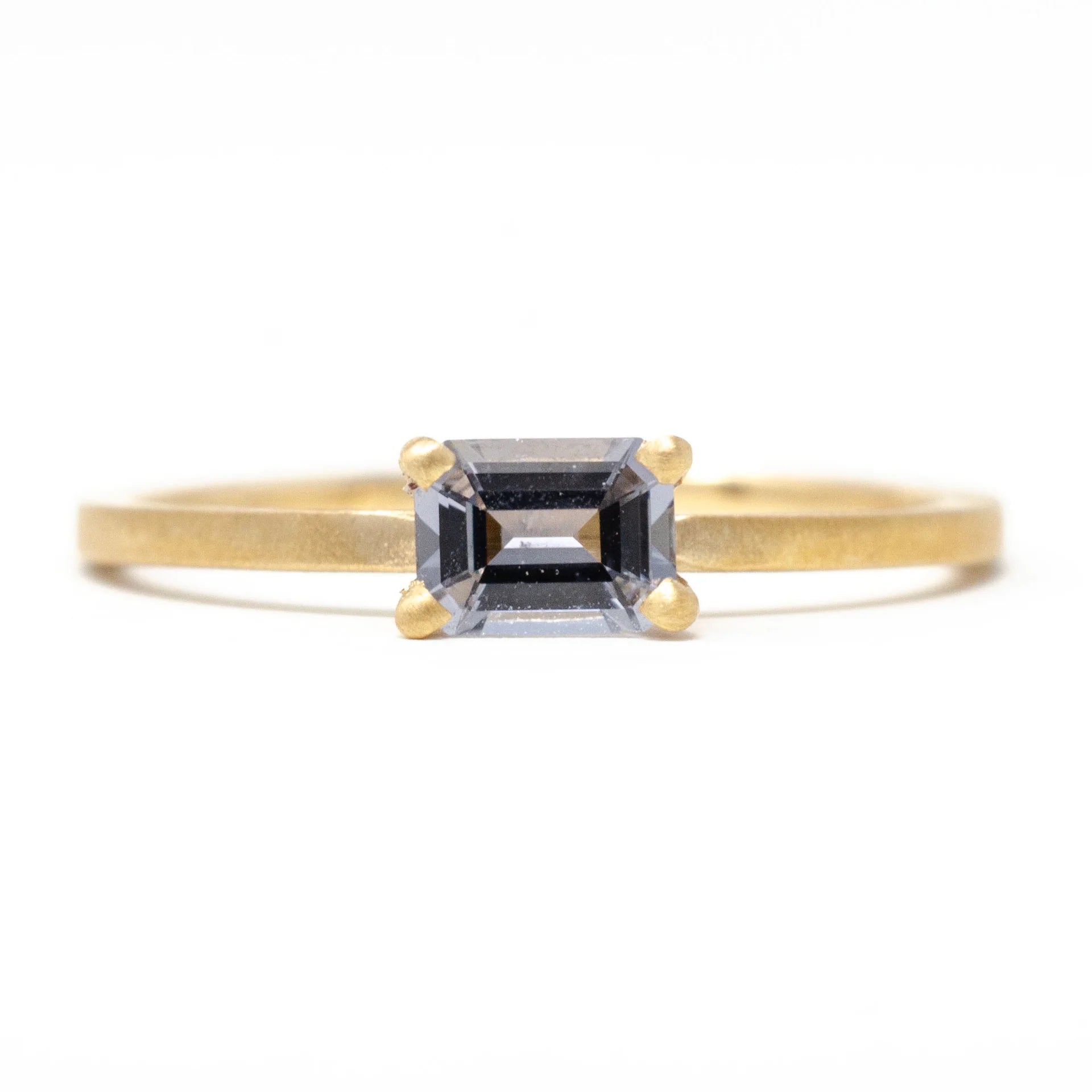 This 14k recycled gold ring features a luminous 5x3mm emerald cut grey spinel prong set horizontally.