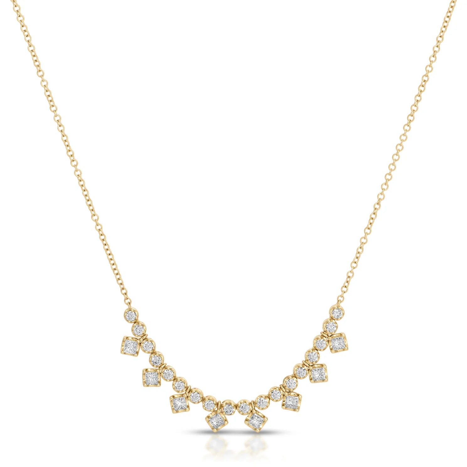 This necklace features crown-set diamonds gracefully accented by eight princess-cut diamonds, all set along our classic cable chain. Designed as a modern yet regal statement, it catches the light and ensures an elegant sparkle from every angle.