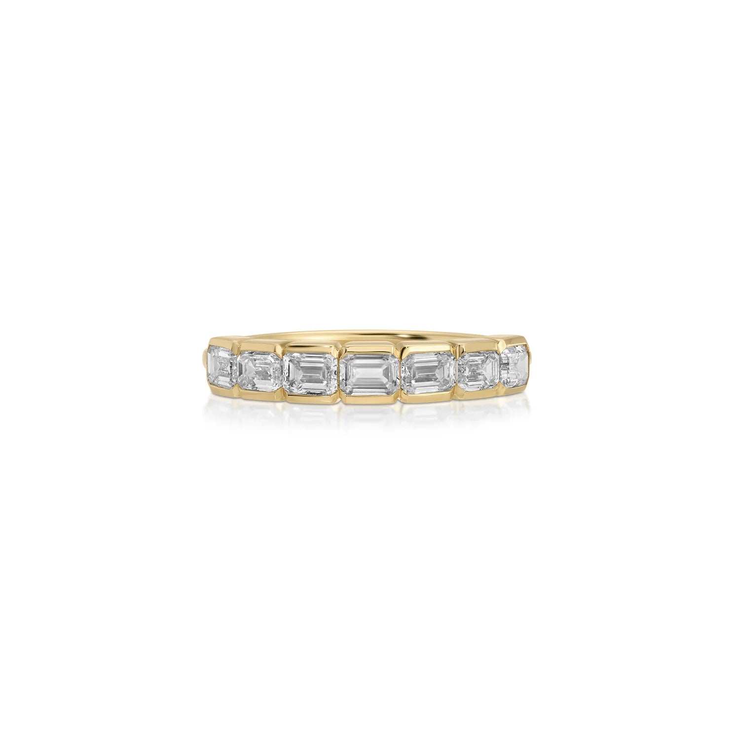 Designed with seven emerald-cut diamonds set side by side in a sleek half-bezel setting, this versatile ring highlights each stone’s signature corners and concentric facets. Wear it as a solo statement or stacked with your favorite EF rings.