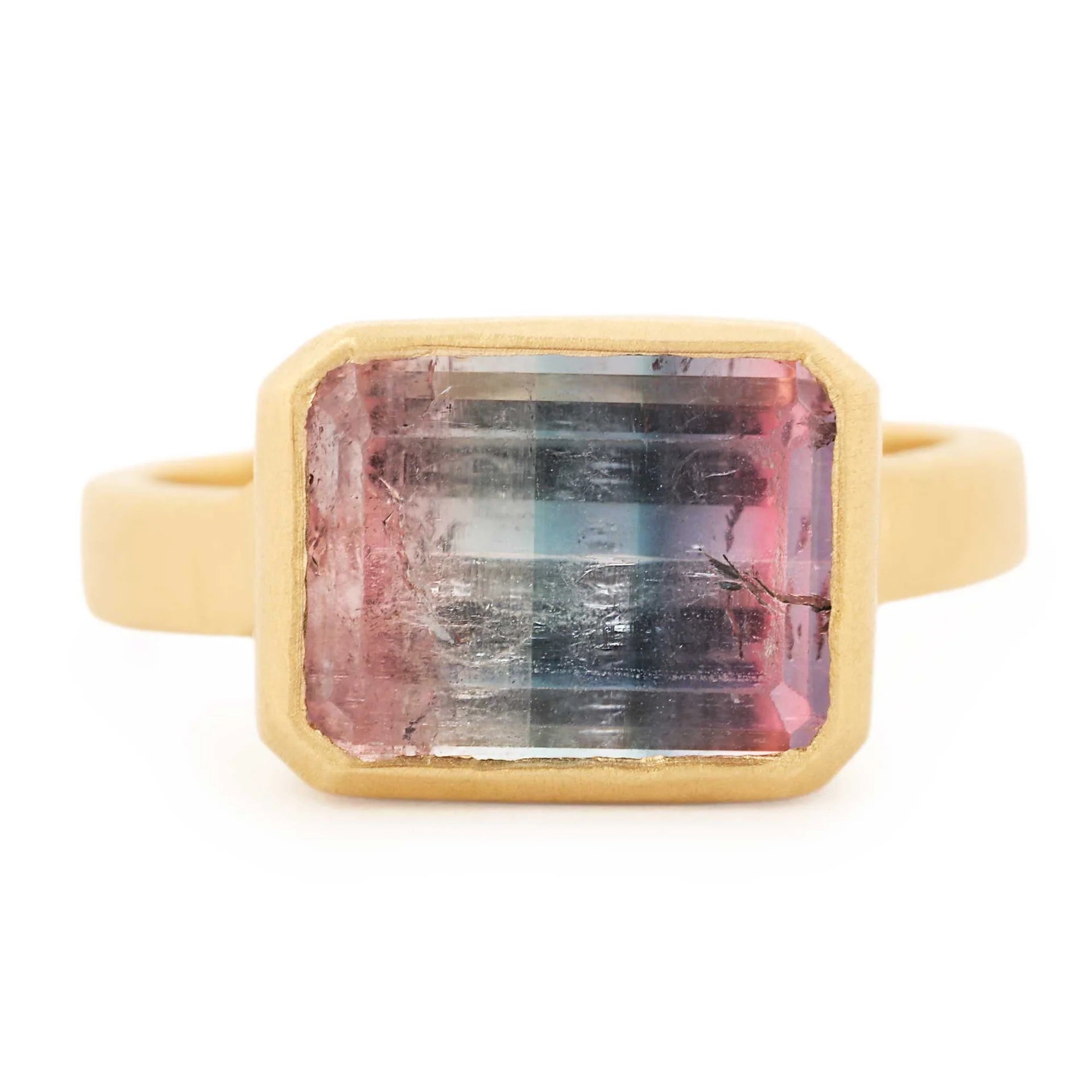 This extremly rare and gorgeous ring will take your breath away time and time again. Framing a tri color tourmaline the pinks and blues will have you swooning.